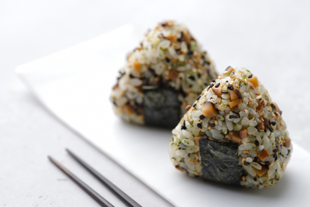 "El onigiri es la versión japonesa del bocadillo. He elegido un tamaño más pequeño para que pueda ser degustado en pocos bocados, como un canapé. Para darle sabor, he combinado el arroz con setas shiitake confitadas, así como con una mezcla de jengibre, sésamo tostado y furikake."