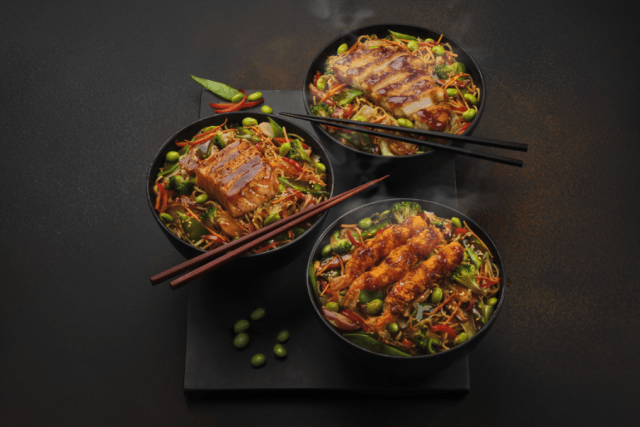 El gran clásico de la cocina japonesa, rediseñado para ofrecer aún más sabor y placer. Elaborado a partir de una base única de fideos de trigo salteados con verduras, nuestra nueva receta de Yakisoba se presenta en tres deliciosas versiones: Pollo Katsu, Tempura de gambas y Salmón.